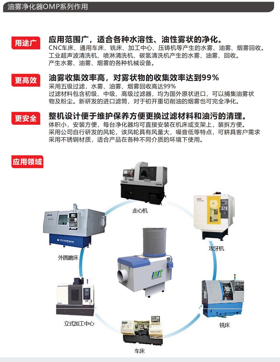 OMP系列是目前最普及的一款產(chǎn)品,用于收集機械加工中心產(chǎn)生的油霧、水霧或者粉塵等,并通過多級攔截和過濾,是其中的有害物質被清楚,金屬切削油等有循環(huán)利用價值的物質被重新回收利用,最后出除潔凈的氣體。